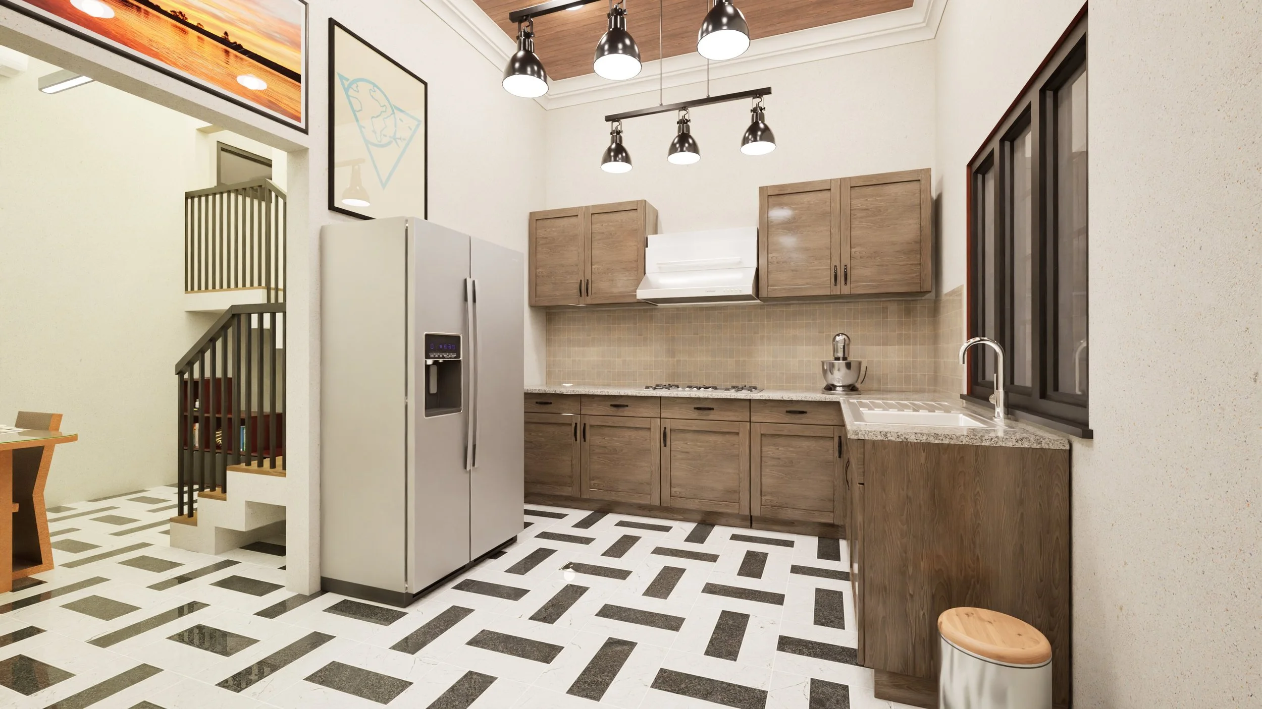 Positioned slightly elevated from the living area, giving a clear separation while maintaining an open-plan feel.Kitchen