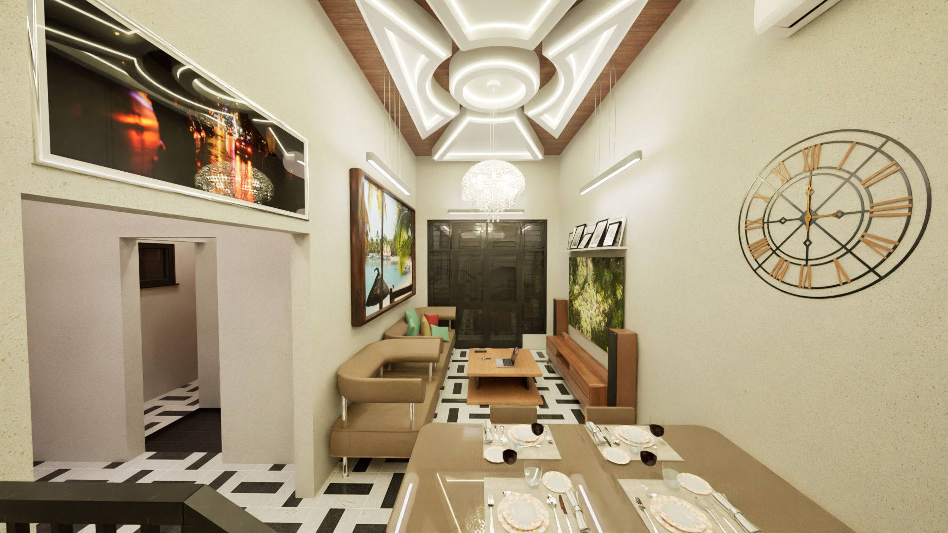 A welcoming living space with higher ceiling feel due to the split-level design. Large windows allow natural light and cross ventilation, creating a calm and relaxing atmosphere.Dining Area