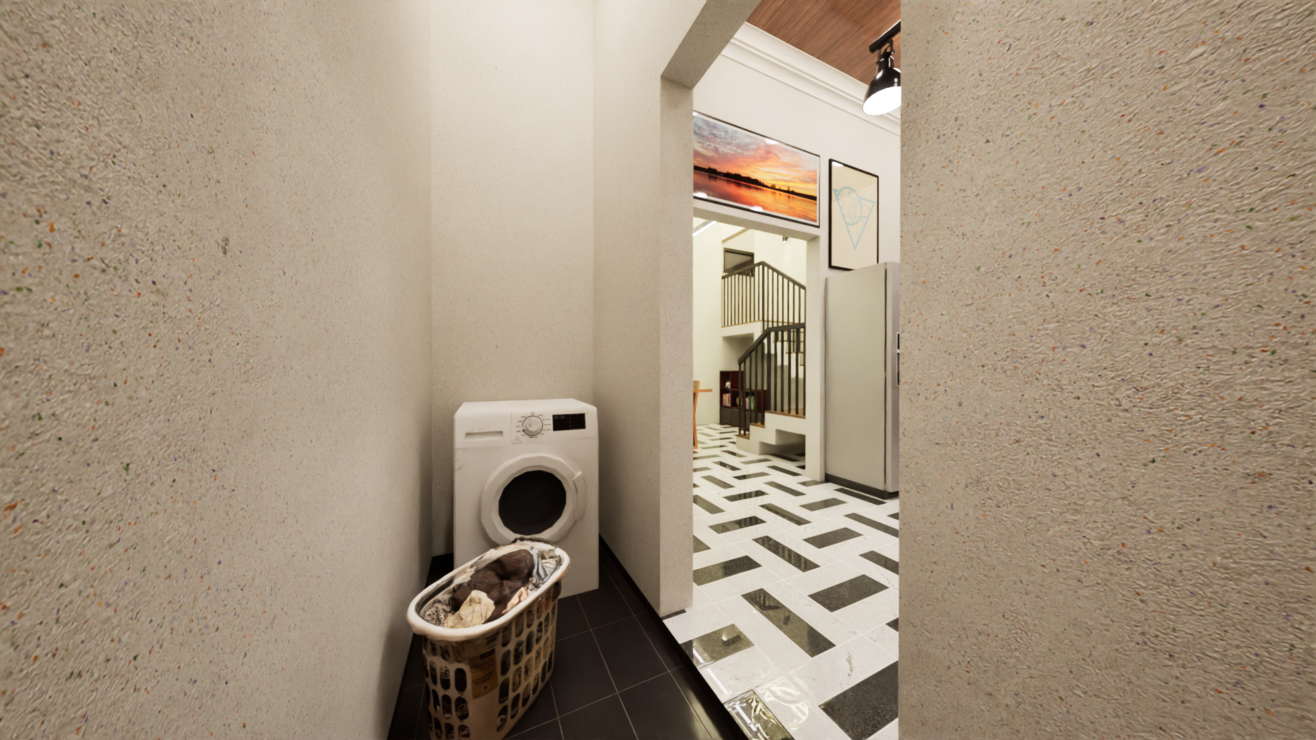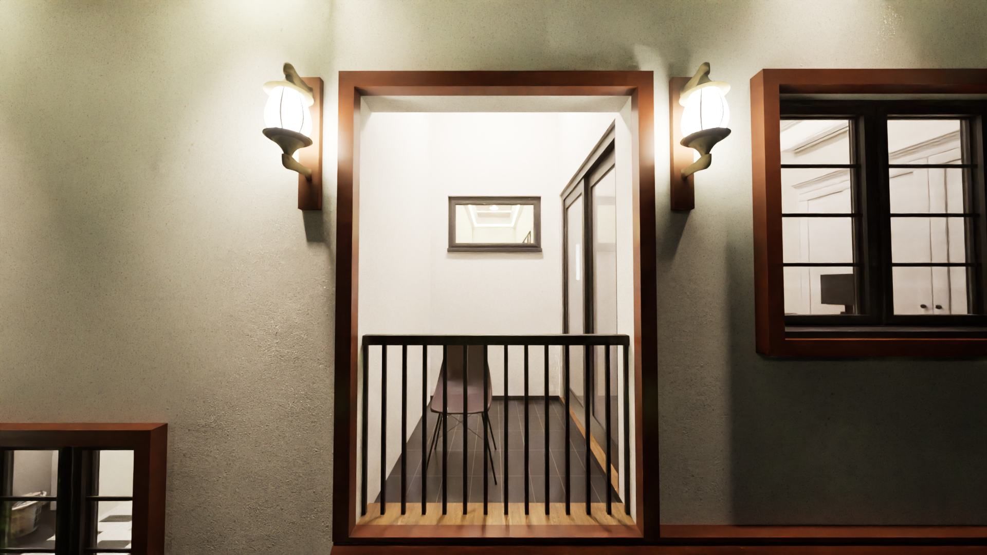 A small upper-level circulation space that connects the bedrooms, enhanced by natural lighting.